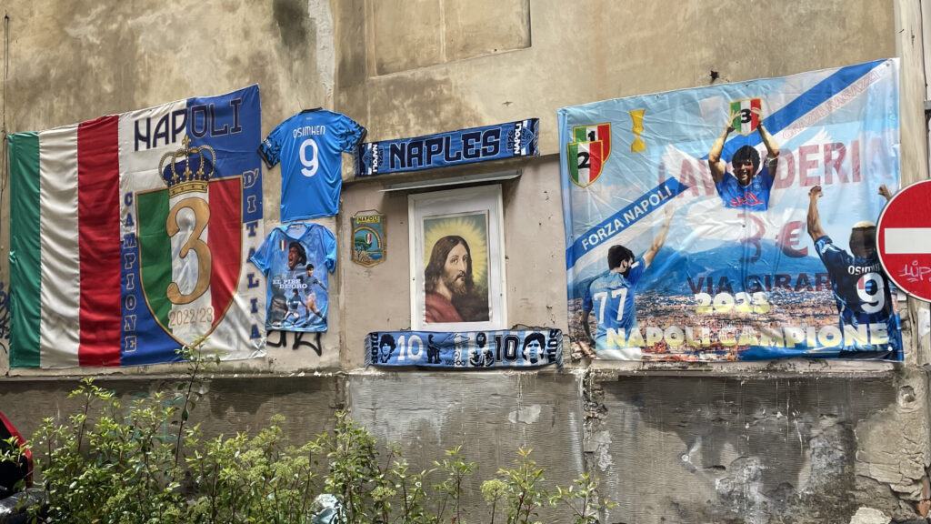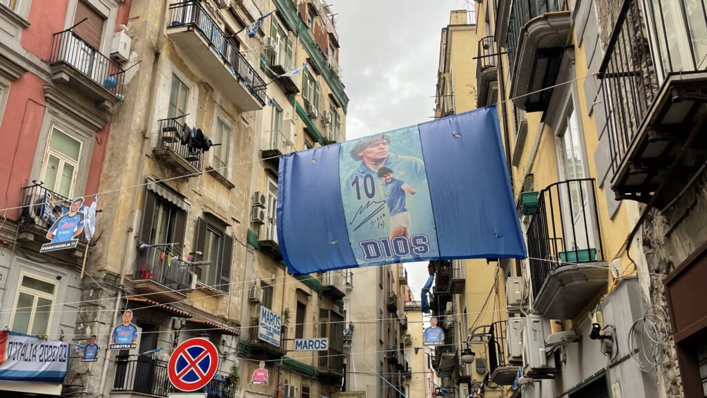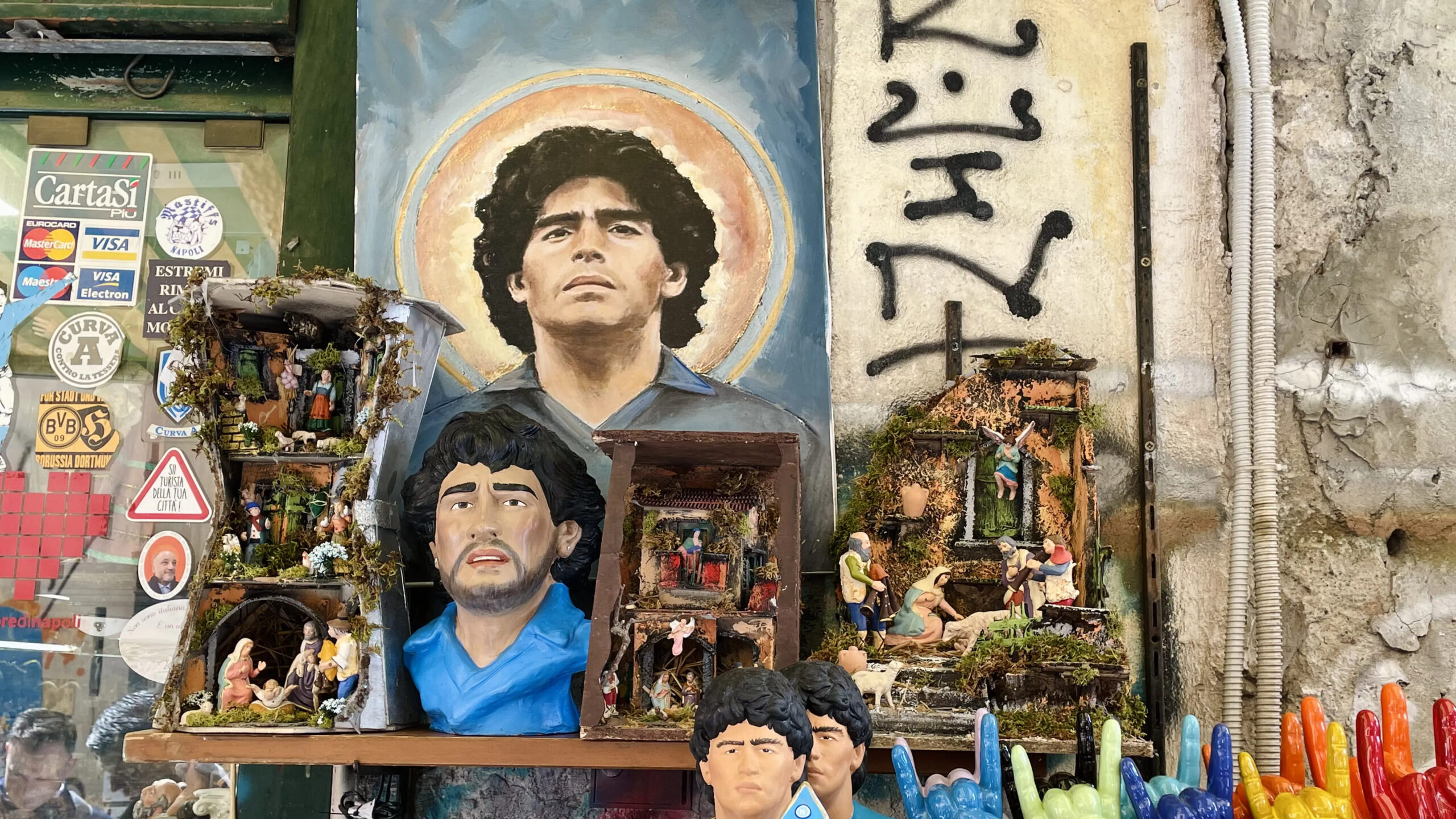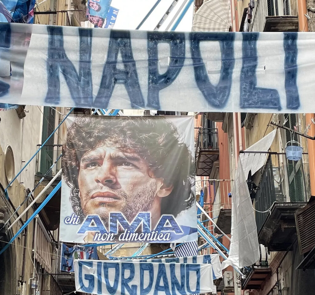 Para los napolitanos, desbordantes de fe y pasión, Maradona fue también una metáfora de su existencia. De la mano del futbolista, que a pesar de nacer en la pobreza de una villa de Buenos Aires desafió a los ricos y los poderosos, Nápoles se redimió de sus humillaciones históricos y obligó, por lo menos en la cancha, a que las poderosas ciudades del norte se arrodillaran ante ella. Razones suficientes para que, desde la muerte de Maradona en 2020, su rostro se haya apoderado de las calles de la ciudad. Se lo ve en banderas, fotos, pancartas, camisetas, carteles y objetos de todo tipo. Maradona es homenajeado en cada casa, en cada cuadra, en cada esquina. Incluso existen altares en los que, a la manera de un santo, se le venera y se le piden toda clase de milagros a este dios inquieto.