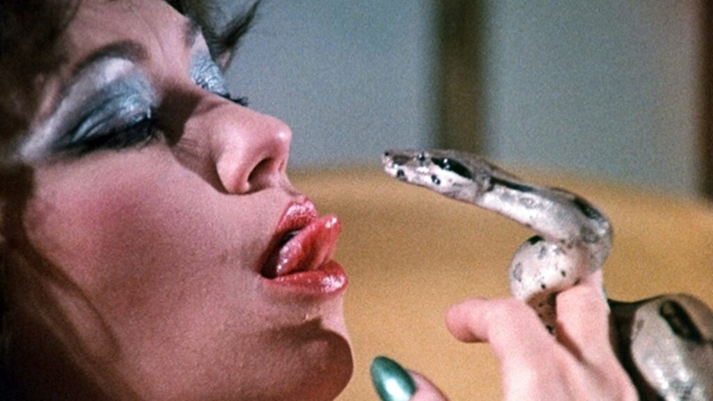 El clímax aumenta cuando entra un hombre de raza negra, luce un largo collar de huesos en su pecho desnudo, de la cintura para abajo viste una trusa blanca con un agujero por el que exhibe su miembro. Se ve como recién salido de la selva. El público quiere tocarlo, pero él se escurre, llega hasta Gloria y su lengua va directo a su sexo. Ella sigue callada, en trance. La penetra. Ese primerísimo primer plano del pene-pelvis-pubis se intercala con uno del rostro de Gloria que parece en éxtasis.