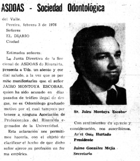 Jairo Montoya Escobar era un diputado liberal que había hecho carrera como odontólogo, aunque luego de su captura la Sociedad de Odontólogos de Risaralda envió una carta a El Diario aclarando que el señor Montoya no era graduado de la Universidad y por lo tanto no era odontólogo profesional. Lo propio hizo la clase política: fue ocho años diputado por el Partido Liberal, pero luego de su captura la prensa aclaró que sí pero no: que él sí era liberal, pero pertenecía a una facción opuesta al oficialismo liberal.