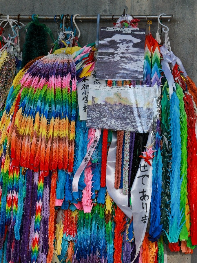 También conocí la historia de Sadako Sasaki. Una niña que con apenas dos años sobrevivió al ataque, pero desarrolló leucemia una década después. A la edad de 12 años, comenzó a plegar grullas de papel con la esperanza de curarse, siguiendo la tradición japonesa que les atribuye inmortalidad y salud. “Si haces 1.000 grullas, se concederá un deseo”, es la creencia tradicional. Según relatos populares, Sadako murió habiendo hecho 644; sus amigos completaron las restantes y la enterraron con estas. La ciudad erigió en su honor el Monumento a la Paz de los Niños. Hoy es un sitio de peregrinación para los estudiantes japoneses, que, como parte de sus compromisos escolares, viajan a Hiroshima a conocer su historia. Durante su visita rinden homenajes a Sadako con cantos y poemas, y además ofrendan miles de grullas de origami con mensajes de rechazo a las armas nucleares y la esperanza de que nunca se repita tal horror.
