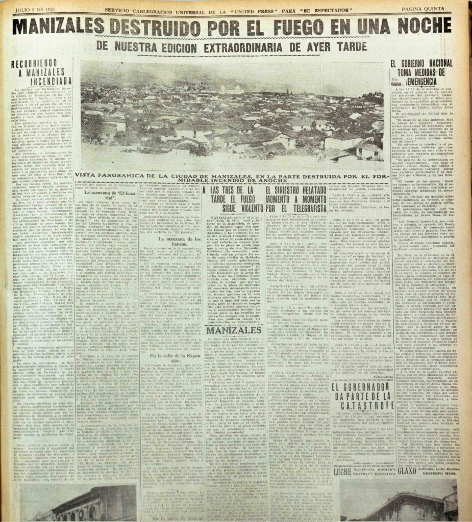 Fue tanta la destrucción que en la película Manizales City decidieron incluir imágenes de la devastación. Esta obra de la naciente industria cinematográfica colombiana surgió como un documental dirigido por Félix R. Restrepo sobre los 75 años de Manizales. En la primera parte, que dura más de 40 minutos, se ven desfiles, comparsas y festejos. Esa iba a ser la película terminada, pero luego del incendio decidieron incluirle una segunda parte. Por eso en el film, luego del jolgorio, aparece un cartel, propio del cine mudo de la época, en el que se lee el siguiente mensaje: La Colombia Film Company, para llamar al corazón de los buenos hijos de la patria, presenta las ruinas, humeantes aún, a que quedó reducida la bella y noble ciudad de Manizales, por el devorador incendio que se produjo en la noche del día 3 de julio de 1925.