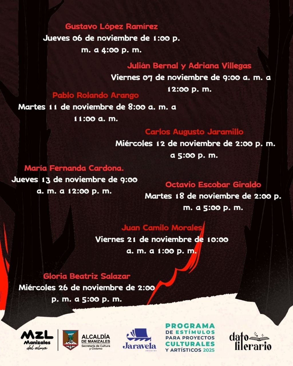 - «Escritura sensorial, creación de escenas y atmósferas vívidas» por Juan Camilo Morales. Viernes 21 de noviembre, de 10:00 a,m, a 1:00 p.m.