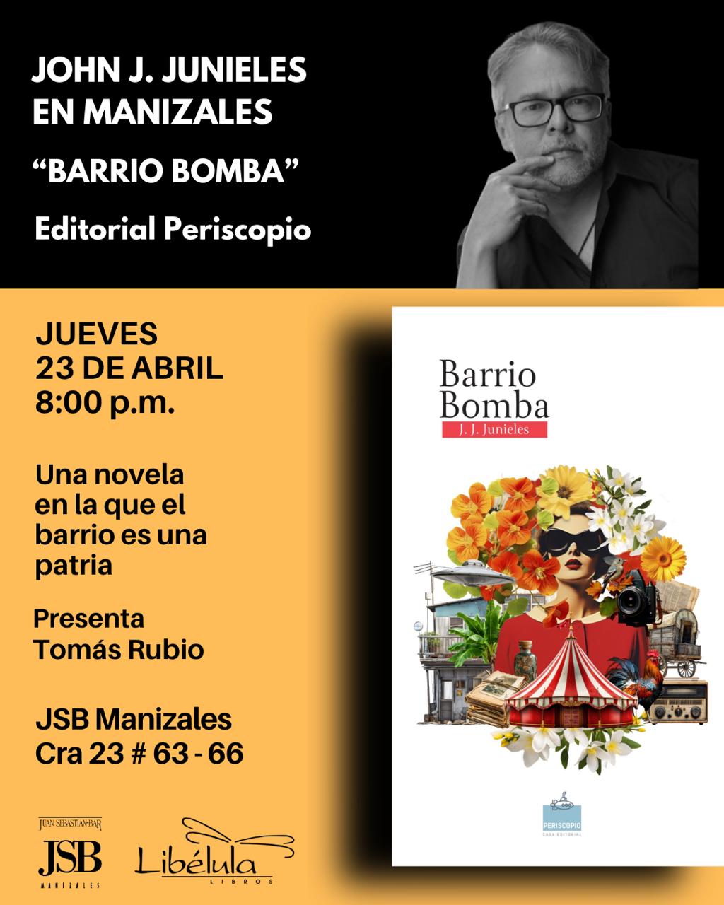 El escritor John J. Junieles (Sincé-Sucre, 1970) conversa este jueves 23 de abril a las 8:00 p. m. en Juan Sebastián Bar con Tomás Rubio, de la Librería Libélula. La charla girará en torno a «Barrio Bomba», la más reciente novela de Junieles, editada por Taller Rocca Ediciones.
