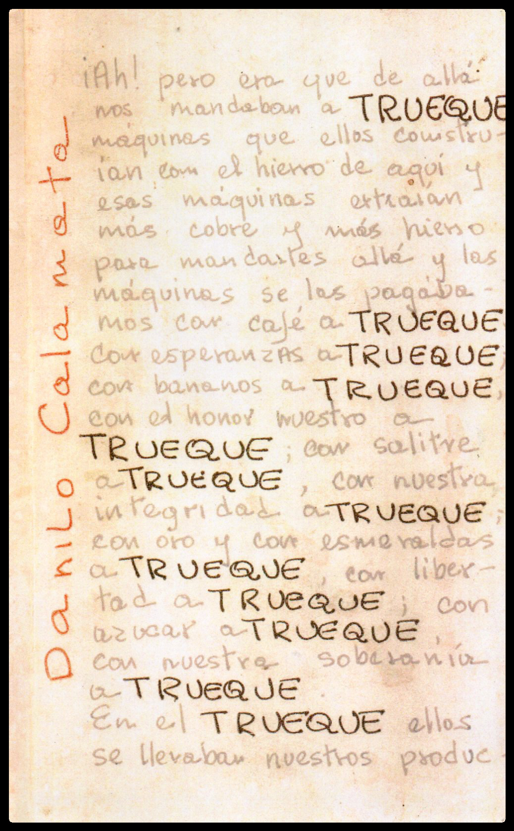 Danilo Calamata subtitula a su novela Trueque (1981) como un «Ensayo de epopeya novelada para una canción de quetzales con águilas y cóndores». Bajo esta premisa, la narración descarta cualquier afán de verificación frente al relato fantástico que la sustenta. Trueque es una narración mítica en la que, más que dar cuenta del origen del café, lo que se propones es una metáfora sobre la explotación de la tierra.