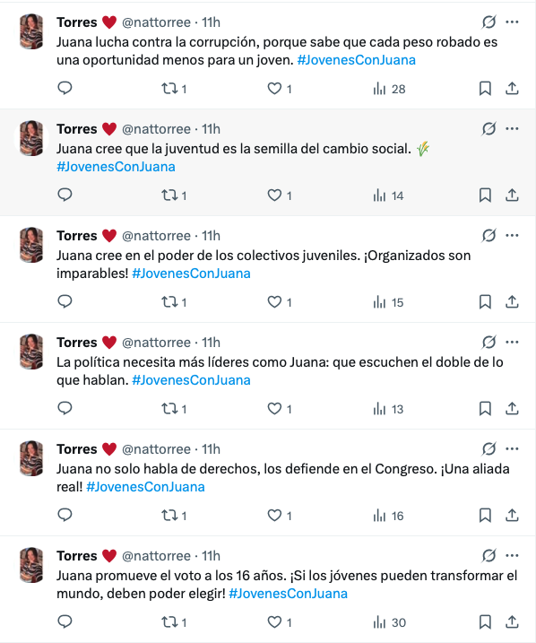 En su hilo, @hyperconectado mencionó primero la cuenta @nattorree, que mostró señales de automatización. Llegó a publicar tres trinos en un minuto, a las 10:25 p.m., un ritmo imposible para cualquier usuario promedio. Además, era uno de los principales generadores de spam a favor de la candidata.
