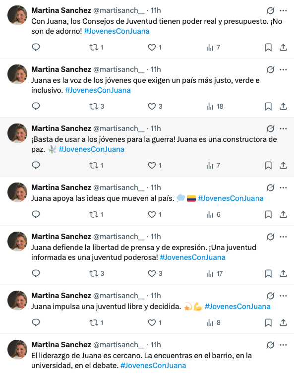 Por ejemplo, hace unos días vimos otro episodio de la representante Juana Carolina Londoño, quien pareció quedar en evidencia. Camilo Andrés García, conocido como @hyperconectado en X, alertó sobre el posible uso de cuentas automatizadas en la campaña de Londoño. Según él, experto en redes e Internet, la representante estaría intentando influir en las tendencias de X mediante bots y perfiles anónimos.