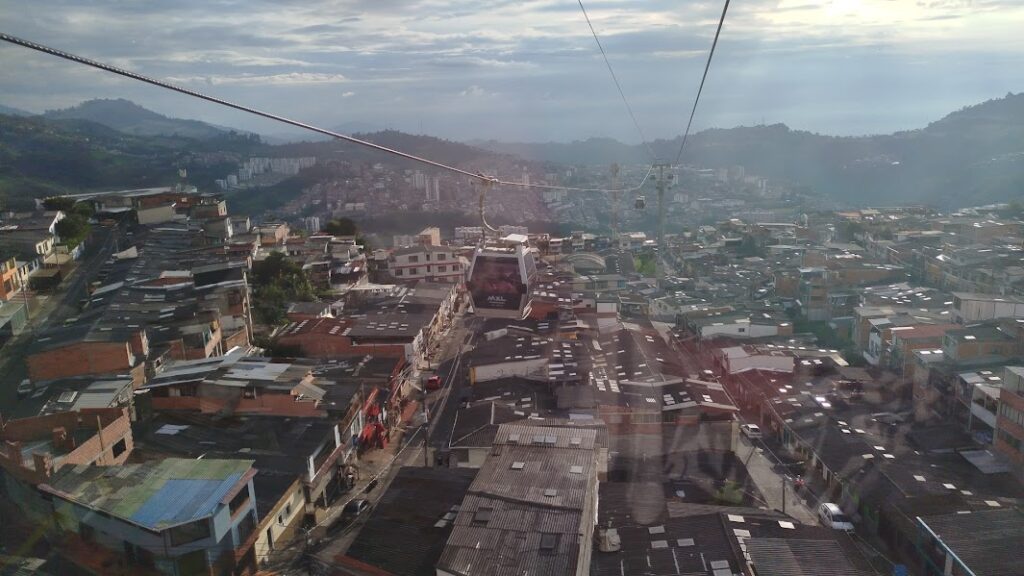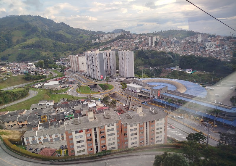 Luego de sobrevolar Fátima la cabina del cable inicia una descolgada vertiginosa hacia la estación Cámbulos, en el Terminal de Transportes y en ese trayecto también aparece la mirada turística sobre nuestra propia ciudad: la pobreza que crece a tan poca distancia del estrato 6, las muchas escaleras que cruzan los barrios, las casas a las que les nacen pisos superiores cada cierto tiempo, las viviendas con solar, gallinas y cultivos, en medio de la ciudad, y la frustración que debe significar ver pasar todos los días un cable sobre las casas sin poder usarlo, porque la gente de Malhabar, Pio XII e incluso Aranjuez quedó cerca de la línea del cable, pero no tan cerca de alguna estación.